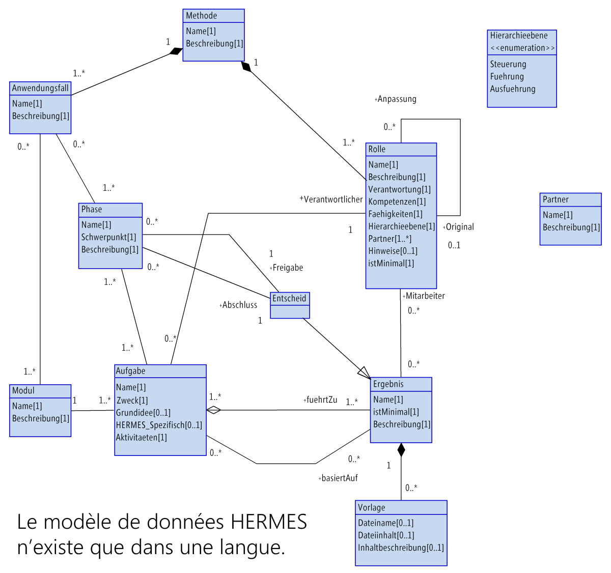Ce modèle de données garantit la cohérence au sein d'HERMES, c'est-à-dire l'uniformité de la structure des données dans un élément méthodologique (il assure par exemple que chaque tâche est assignée à un seul module). En mettant en æuvre le modèle de données HERMES DDPS, les données peuvent être enregistrées, affichées et créées avec le degré de détail approprié.
